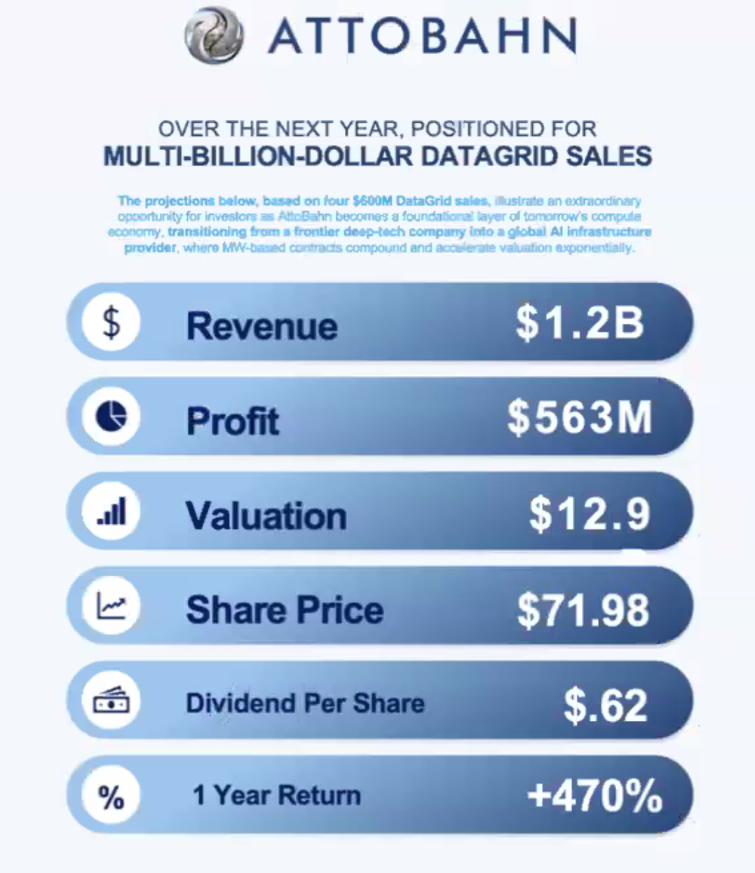 AttoBahn presents itself as a once-in-a-generation infrastructure breakthrough. According to its own materials, the company has built a new internet architecture that replaces TCP/IP, eliminates latency, reduces data-center power consumption by 95%, requires no water cooling, guarantees total cybersecurity, and will generate hundreds of millions — even billions — in near-term revenue. Shareholders are told this technology could redefine global communications and scale into a trillion-dollar enterprise.
